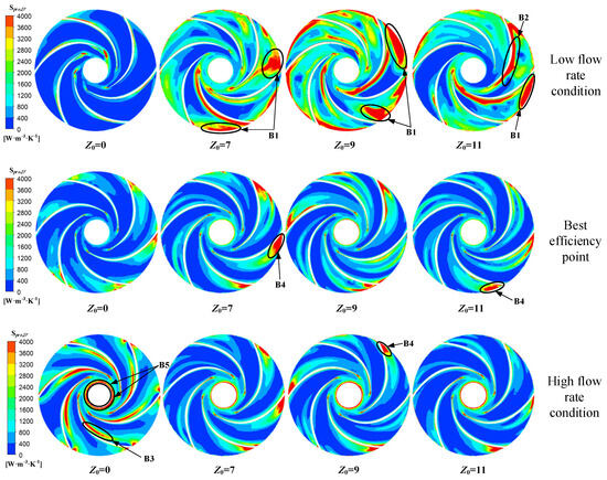 Region B4 was located at the pressure surface of the blade’s leading edge. When fluid passed through the guide vanes and entered the impeller, the incoming flow directly impinged upon the pressure surface of the blade’s leading edge. The fluid in this region exhibited strong disordered characteristics during flow, leading to the occurrence of flow separation, which resulted in a highly disordered flow regime. This caused a significant non-uniformity in the velocity distribution and a continuous increase in the turbulent entropy generation rate in this region. Additionally, flow separation in this area induced turbulence, significantly increasing the turbulent vortex frequency. As the flow rate increased, the incoming flow velocity rose, intensifying the impact of the fluid on the pressure surface of the blade’s leading edge and further exacerbating energy dissipation, thus sustaining the turbulent entropy generation rate within region B4 at a relatively elevated level.