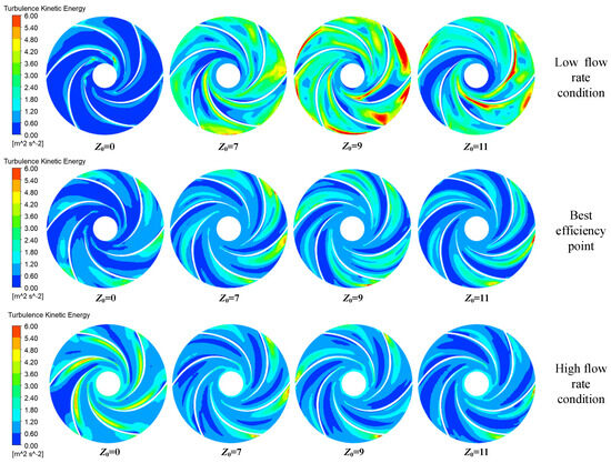 Region B1 was located near the impeller inlet and was particularly evident under low-flow-rate conditions. This occurred because, under these operational conditions, the relative flow angle remained smaller than the blade’s inlet setting angle, thereby triggering the formation of a negative incidence angle at the blade inlet. At this point, the liquid flow impinged on the pressure surface of the blade, causing an increase in pressure in the vicinity, while the fluid struggled to flow smoothly along the blade’s surface, thereby inducing flow separation in the vicinity of the blade’s pressure surface. From the velocity streamline distribution in the impeller mid-section shown in Figure 11, it can be seen that backflow and vortices formed in the vicinity of local regions, increasing the complexity of the flow and energy losses. Meanwhile, the rotor–stator interaction between the impeller and guide vanes generated periodic pressure pulsations and velocity fluctuations near the interface, enhancing the turbulent intensity of the flow field. Additionally, the upstream region corresponded with the guide-vane flow domain, where the flow state of the fluid at the trailing edge of the guide vanes underwent significant changes, forming wake flows that caused the flow to become more disordered and increased the turbulence intensity. Consequently, turbulent kinetic energy increased in this area. Affected by this, when the fluid flowed from the wake region into this area, high entropy generation regions emerged.