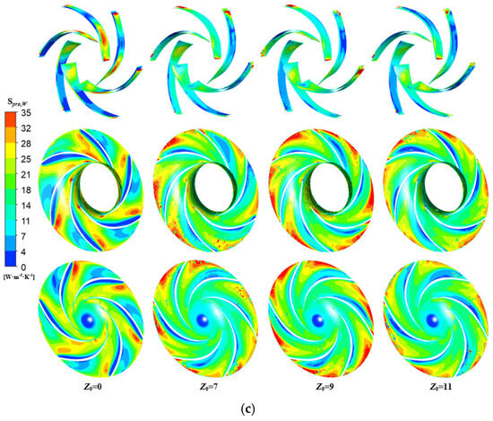 Distribution of entropy generation rates on the impeller wall. (a) Low−flow−rate condition, (b) best efficiency point, and (c) high−flow−rate condition.