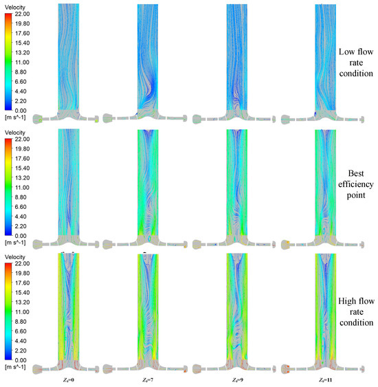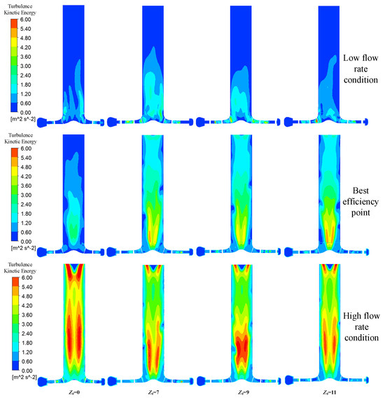 Figure 13 and Figure 14 show the distribution of turbulent entropy generation rates and the turbulent kinetic energy in the draft tube under different numbers of guide vanes. During low-flow-rate operation, the entropy generation rates in the draft tube of hydraulic turbines with varying numbers of guide vanes were negligibly low. For the optimal operating condition, narrow strip-shaped regions with relatively high entropy generation rates appeared in the mid-channel of the upstream draft tube for the guide-vane-equipped turbine models, with minor differences in both the magnitude and spatial distribution of the entropy generation rates. Under high-flow-rate conditions, the area of high entropy generation regions expanded, particularly showing the most significant changes for the Z0 = 0 turbine. The high entropy generation regions were located near the mid-channel of the upstream draft tube, while conical low entropy generation regions emerged in the mid-channel of the draft tube outlet section, with patchy high entropy generation regions appearing on both sides of these conical regions. The Z0 = 0 turbine exhibited a larger area of high entropy generation rates, while the guide-vane-equipped turbine models featured smaller high entropy generation regions. A low entropy generation region appeared in the mid-channel of the downstream draft tube, and this region gradually decreased as the number of guide vanes increased. Under high-flow-rate conditions, when the fluid discharged from the impeller entered the draft tube, a significant velocity circulation increased the turbulent kinetic energy at the draft tube inlet and induced vortices, leading to a substantial increase in the turbulent entropy generation rate in this region. It can be observed from the velocity streamline distribution in Figure 15 that under low-flow-rate conditions, the streamline distributions of the four models were relatively uniform, with stable flow characteristics. As the flow rate increased, the flow field became increasingly complex, exhibiting large-scale backflow and vortices, which were more pronounced near the draft tube inlet and at the outlet.