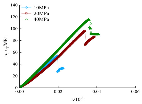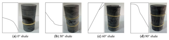 The triaxial compressive stress–strain curves of layered shale under different confining pressure conditions are presented in Figure 6, Figure 7, Figure 8 and Figure 9, from which the following observations can be made: