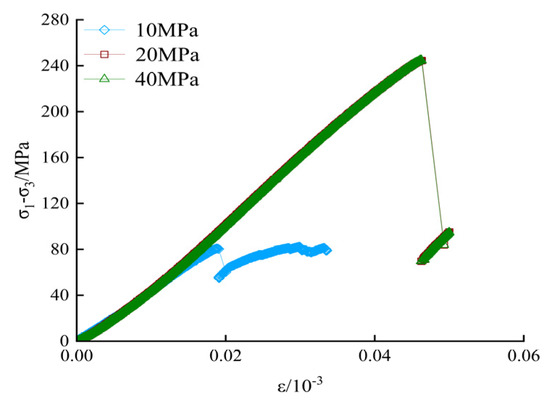 (2). In the compaction stage, initial microcracks within the rock gradually close as stress increases, resulting in an upward concave trend in the stress–strain curve. During the elastic phase, the stress–strain curve exhibits linear behavior as deviatoric stress increases, and the inflection point of volumetric strain corresponds to the cracking stress of the respective rock sample. In the yielding stage, internal cracks begin to propagate stably, leading to a gradual transition from expansion to compression. The axial stress–strain curve starts to flatten, with a significant decrease in slope, indicating the onset of plastic deformation and yielding. In the failure stage, rock samples exhibit pronounced brittleness, characterized by a sudden drop in deviatoric stress and abrupt specimen failure. However, with increasing confining pressure, brittle damage transitions to ductile damage, and residual strength increases.
