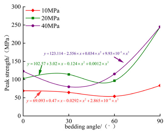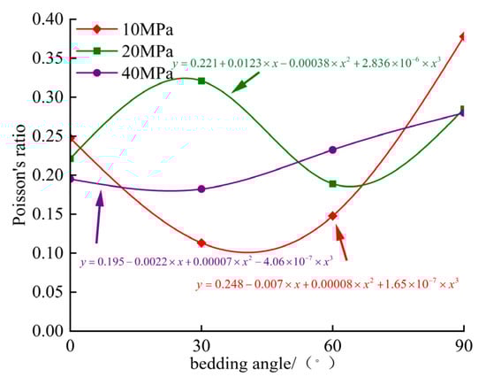 (2). With the increase in the bedding angle, Poisson’s ratio of the rock samples exhibits a U-shaped curve, initially decreasing and then increasing, indicating that the bedding angle has a substantial influence on Poisson’s ratio. Overall, under different confining pressure conditions, Poisson’s ratio reaches its maximum value when the bedding angle is 90°. The magnitude of Poisson’s ratio varies significantly when confining pressure increases from 10 MPa to 20 MPa, but the variation becomes relatively smaller when confining pressure increases from 20 MPa to 40 MPa. Notably, at 20 MPa confining pressure and a bedding angle of 30°, Poisson’s ratio of the rock samples is unusually high for two reasons: Firstly, the brittle destructive characteristics of hard rock lead to dispersion in peak strength at failure. Secondly, potential installation faults in annular hoops or annular transducers during testing may result in an overestimated Poisson’s ratio.