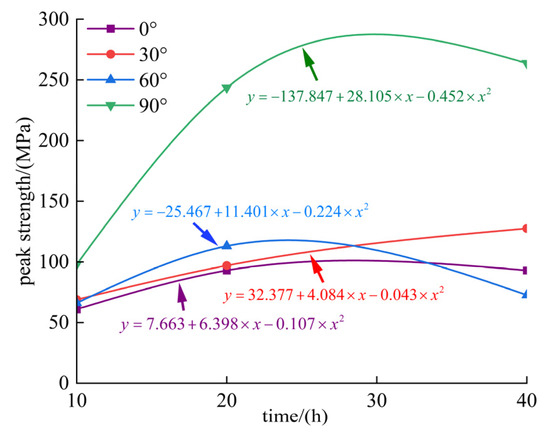 From Figure 10 and Figure 11, it can be observed that as the bedding inclination angle increases, the peak strength of the rock samples at failure exhibits a U-shaped trend, initially decreasing and then increasing. Additionally, with increasing confining pressure, the corresponding peak strength of the rock samples at failure also increases. When the confining pressure is 40 MPa, the peak strengths of the 30° and 60° rock samples are lower. This may be attributed to the internal porous structure of the samples or disturbances introduced during the drilling process, leading to microcracks along the weak bedding surfaces. Consequently, these factors result in lower wave velocities during wave velocity tests. Therefore, when failure occurs along the weak bedding surface, the peak strength of the rock samples is reduced.