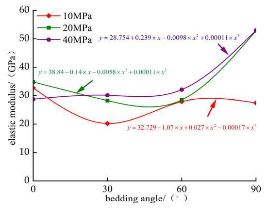 (1). Under low confining pressure conditions, due to the inherent brittleness of hard rock and the limited development of internal voids, the rock samples remain relatively intact as a whole. Consequently, the compaction stage is not pronounced, leading to poor compaction effects. Therefore, the change in elastic modulus follows a similar trend to that of peak strength, showing a U-shaped trend of first increasing and then decreasing. As confining pressure increases, the elastic modulus of shale with different bedding angles generally shows an increasing trend, primarily due to the densification effect of confining pressure on the rock samples during loading. Specifically, at 20 MPa confining pressure, the elastic modulus of the rock samples first decreases and then increases with the increase in the bedding angle. At 40 MPa confining pressure, the elastic modulus gradually increases with the increase in the bedding angle. When the bedding angle is 0°, the weak bedding surface is perpendicular to the direction of partial stress, resulting in better compression during the compaction stage and larger axial compressive deformation, which leads to a smaller elastic modulus. When the bedding angle is 90°, the weak bedding surface is parallel to the direction of partial stress, resulting in smaller axial compressive deformation and a larger elastic modulus. The magnitude of the elastic modulus changes significantly when confining pressure increases from 10 MPa to 20 MPa, but the change becomes relatively smaller when confining pressure increases from 20 MPa to 40 MPa. This indicates that the increase in confining pressure has a more significant effect on the elastic modulus under low confining pressure conditions, while its influence gradually diminishes under high confining pressure conditions.