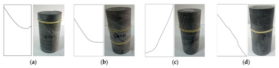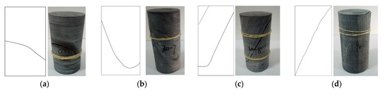 The shale samples utilized in this study were collected from the Baokang Tunnel of the Zhengwan Railway. The rock type is slightly weathered shale with well-defined bedding planes. To ensure the representativeness and consistency of the samples, all the rock samples were taken from the same rock mass, and the variable-angle rotary table was used for precision processing, and four groups of standard cylindrical specimens with diameters of 50 mm × 100 mm with laminar inclination angles of 0°, 30°, 60°, and 90° were prepared. As illustrated in Figure 1, the 0° angle corresponds to transversely isotropic samples, while the 90° angle represents samples perpendicular to the transversely isotropic orientation. During sample preparation, the angle between the cutting surface and the bedding plane was precisely controlled to strictly adhere to the design specifications (with a tolerance of ±2° to ±5°). To validate the accuracy of the samples, an ultrasonic thickness gauge was employed to measure all the specimens. The precision of the bedding angles was confirmed by analyzing variations in the propagation speed of ultrasonic waves in different directions, and any samples that failed to meet the criteria or exhibited significant surface defects were discarded. To further ensure data reliability, 10~20% of the samples were randomly selected for re-inspection, during which the angle verification and integrity checks were repeated. Additionally, the height, diameter, surface flatness, density, and wave velocity of the samples were measured, and only those with closely clustered physical properties, such as wave velocity and density, were chosen for subsequent testing.