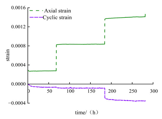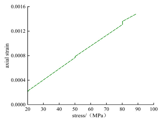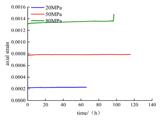 As illustrated in Figure 19, the axial strain of shale increases with the applied stress. The deformation in the strain–time curve can be divided into two distinct components: (1) A sudden increase in axial strain due to transient strain that occurs during the loading process as a result of increasing deviatoric stress. (2) Creep strain that develops due to specimen deformation under a stable stress state.