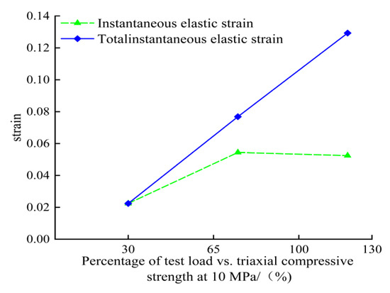 The axial deviatoric stresses applied to the specimens were 30%, 75%, and 120% of the triaxial peak compressive strength (under 10 MPa confining pressure). As shown in Figure 20, under low-stress conditions, the instantaneous elastic strain of the 60° bedding angle rock samples is higher because slip shear damage along the bedding surface results in larger shear displacements. Under high-stress conditions, the instantaneous modulus of elasticity of the specimen becomes more stable, leading to a stabilization of the instantaneous elastic strain; thus, the increase in total instantaneous strain also tends to stabilize.