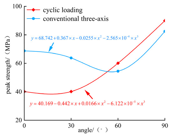 Cyclic loading and unloading versus conventional triaxial test peak strengths for shale with different bedding inclinations.