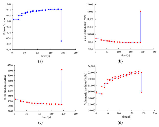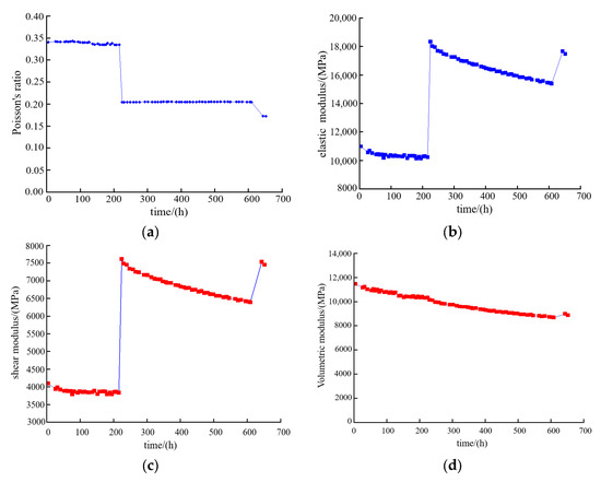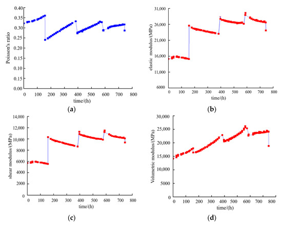 (4) During cyclic loading and unloading creep tests, Poisson’s ratio exhibits a gradual increasing trend, while the elastic modulus, shear modulus, and bulk modulus show a gradual decreasing trend.