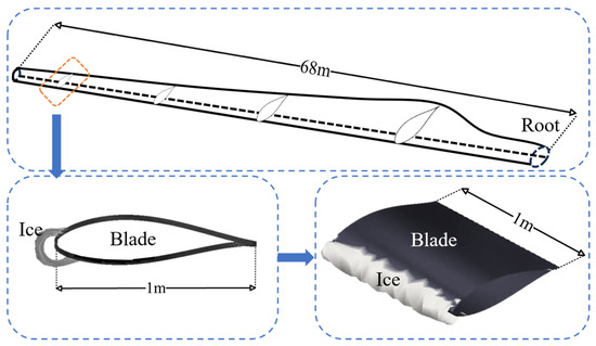 In previous studies, blade elements with a length of 1 m were commonly selected. For the blade under investigation, a 1 m blade element located 60 m from the root falls within the range of 1/2 L from the blade tip. To meet operational and maintenance requirements while facilitating data comparison and verification related to ice accumulation, a blade element with a radial length of 1 m and positioned 60 m from the blade root was chosen for analysis. As shown in Figure 1, a three-dimensional model with a radial span of 1 m was developed to accurately simulate and measure ice accretion.