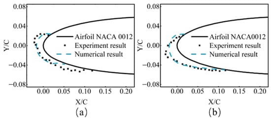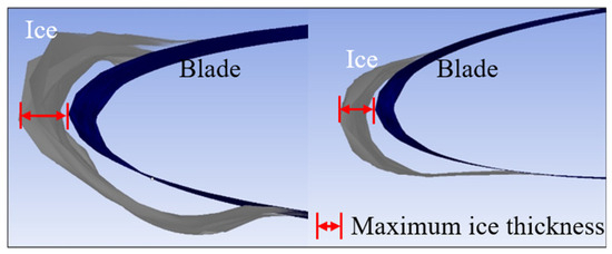 As shown in Figure 4, compared with the data obtained in the laboratory under the same operating conditions [27], the maximum thickness of glaze ice and rime ice is basically the same. Notably, the maximum thickness defined in this study is the greatest transverse distance of ice accumulation from the leading edge of a blade element to the tip of the ice at that leading edge. By observing the area of ice, the results of the rime ice were determined to be better, and both glaze ice and rime ice can meet engineering requirements. These validations ensure the simulation results’ accuracy and provide a robust foundation for subsequent research on icing prediction and analysis under similar conditions.