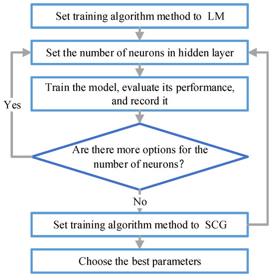 To achieve optimal predictive performance, two optimization algorithms were implemented following the methodology illustrated in Figure 6. The Levenberg–Marquardt (LM) algorithm, known as damping least squares, was employed to address nonlinear least squares problems [40]. This algorithm is widely recognized as the most frequently used method for optimizing weights and biases in MLP neural networks. Additionally, the Scaled Conjugate Gradient (SCG) algorithm, which operates within a gradient descent framework, was utilized to expedite the optimization process by conducting searches in the conjugate direction. In applying SCG, the search direction was aligned with the steepest descent of the gradient function, ensuring minimal error while maintaining computational efficiency [41].