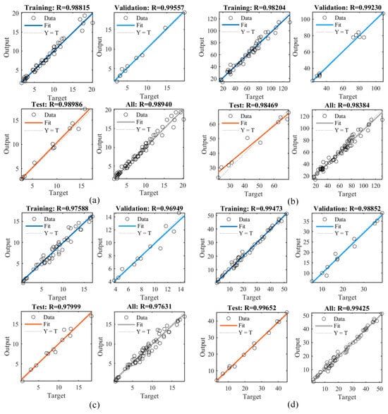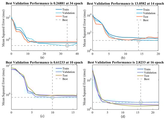 The convergence curve of the model is depicted in Figure 8, which also presents the optimal validation performance for each model. The primary objective of the training process is to obtain predicted outputs for all input values of the network while minimizing the error function. The network learns and adjusts the input weights through an iterative approach to achieve optimal training. In this study, a maximum of 1000 iterations were considered, and the error parameter of the network was defined as the MSE, calculated as the mean squared difference between the predicted output and the target value. The validation set was utilized to evaluate the model’s performance. The training was halted when the validation set’s accuracy peaked and showed no improvement over the subsequent six iterations, indicating that the model was well-trained. The goal was to minimize the average number of errors as much as possible, with lower values indicating better performance. One epoch represents that all training data is fully learned by the model once. If the MSE of the validation set decreases very little (below the preset threshold) in several consecutive iterations, the model is considered to have converged. If the validation set error starts to rise (overfitting), the iteration will also end at this epoch. A zero-error value would signify perfect prediction. The best dashed line in the figure represents the ideal result for the current training steps. Among the four models, the MSE values for the training, validation, and testing datasets generally decreased. These trends did not indicate overfitting, suggesting that the network was adequately trained and capable of generalizing well to unseen data.