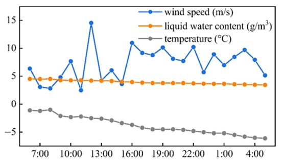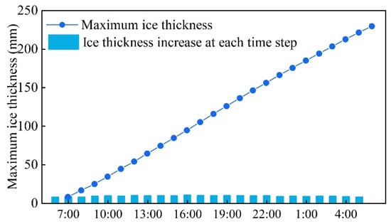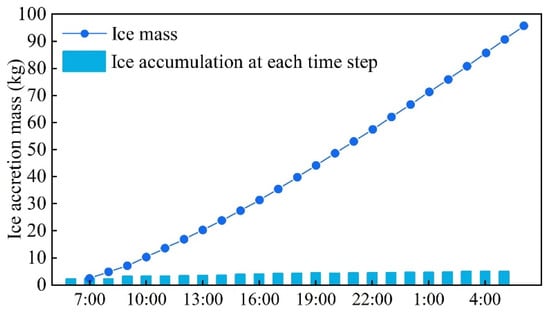 Figure 11 illustrates the variations in meteorological parameters during a long icing period, with data sourced from wind turbine sensors at a local wind farm located at 27° N and 117° E. As shown in Figure 11, the temperature around the wind turbine blades ranges from approximately −1 °C to −6 °C, which is the temperature for the formation of glaze ice. Consequently, the glaze ice prediction model was utilized for calculations, and the predicted results are presented in Figure 12 and Figure 13. In Figure 12 and Figure 13, the bar charts represent the incremental ice accretion from one time point to the next, while the line charts depict the cumulative ice accretion from the start of the period to the current time point. Figure 12 reveals that the maximum hourly ice accretion mass is 5.01 kg, with a cumulative ice mass of 95.43 kg over 24 h. Similarly, Figure 13 shows that the maximum hourly ice accretion thickness is 10.38 mm, with a cumulative ice thickness of 228.43 mm over the same 24 h period.