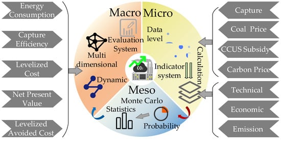 Under the dual-carbon targets, global coal power faces common challenges like high retrofit costs and uncertain carbon pricing, while China additionally confronts peak-shaving constraints, limited storage assessments, and regulatory delays. Carbon capture, utilization, and storage (CCUS) technology has emerged as a critical breakthrough due to its dual role in emission reduction and energy security. However, existing evaluation methods fail to comprehensively reflect the synergies among technical performance, economic feasibility, and environmental benefits [,,]. Traditional assessment systems often analyze single indicators in isolation, neither quantifying the impact of technological degradation on long-term emission reduction efficacy nor dynamically capturing the marginal effects of carbon price fluctuations and policy adjustments. This makes it difficult for decision-makers to balance short-term costs with long-term carbon-neutrality goals [,]. Therefore, constructing a dynamic evaluation system integrating technical parameters, economic costs, and policy variables has become an urgent need to address the bottlenecks of coal power CCUS transition and optimize resource allocation []. Beyond conventional chemical absorption, emerging CO2-capture technologies, such as membrane separation, cryogenic distillation, solid adsorption, and biological fixation, offer advantages like lower energy use and system integration potential. A novel demand-side management strategy involves a radiofrequency (RF) heated fixed-bed reactor using a CaCO₃ sorbent for CO2 capture. This system is designed to respond rapidly to grid fluctuations by operating during off-peak hours, aiming to reduce CO2 emissions from peaking power plants and improve electricity grid stability []. A comparative investigation of CO2 desorption performance from microporous activated carbon (AC) used two techniques: Microwave Swing Desorption (MSD) and Temperature Swing Desorption (TSD). A modified microwave oven and a conventional oven were used to heat the AC bed at two target temperatures: 70 °C and 130 °C [].