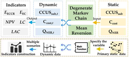 Figure 2 shows the process of indicator dynamization. Monte Carlo simulation is chosen for its ability to model complex, multidimensional uncertainties in CCUS, integrating diverse probabilistic distributions for a comprehensive risk analysis, and real-time decision-making. Compared to deterministic or less scalable methods, it offers superior flexibility and robustness. The distributed Monte Carlo simulation framework enables the real-time processing and analysis of large-scale carbon emission data, significantly improving the accuracy and efficiency of carbon emission assessments []. The carbon capture rate in variable , denoted as , can be dynamically modeled using a Markov chain for degradation, which accounts for the efficiency decay caused by equipment aging. This approach enables the dynamic adjustment of the carbon capture rate, reflecting the impact of equipment deterioration on performance over time.