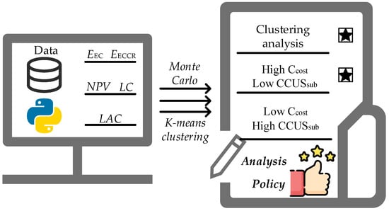 In traditional assessment systems, economic evaluation indicators primarily include the net present value (NPV) and levelized cost (LC). Methods such as Pareto optimality strategies and eco-techno-economic analysis are employed. Li M. et al. proposed an ecosystem-based CCUS innovation strategy (eco-CCUS), which utilizes unexploited crop straw as feedstock to achieve low-cost, large-scale carbon sequestration. The study analyzes the economic feasibility of this technology in rural China, demonstrating that its cost-effectiveness is closely related to the crop density, GDP levels, and transportation distance. A Pareto optimality strategy was used to optimize nationwide deployment plans []. Yan L. et al. systematically reviewed the status and prospects of CCUS-EOR (enhanced oil recovery) technology from an eco-development perspective. By comparing China and the U.S., the study reveals a significant gap in the technological maturity, application scale, and production enhancement effects, with the U.S. leading. It quantifies the economic feasibility of this technology in oil-rich, low-permeability fields and proposes differentiated technical recommendations []. Barati K. et al. conducted Aspen Plus modeling and an eco-techno-economic analysis to compare the economic and environmental benefits of CCU-assisted electrocatalytic reforming (E-CRM) with traditional natural gas-to-methanol (TRM) and CCS pathways. The study highlights a threshold effect of the electricity cost and carbon intensity: when grid carbon intensity falls below 37 g CO2/kWh, the lifecycle emission reduction cost of the electrocatalytic pathway outperforms CCS technology, providing a quantitative decision-making basis for CCU industrialization in low-carbon power regions []. Emission standards are another critical aspect of CCUS technology. Mon, M.T. et al. evaluated the relationship between the CCUS capacity and carbon emissions in the U.S. using six econometric models. The elastic net model best explained the CCUS capacity, while the ordinary least squares (OLS) model performed best in explaining carbon emissions. The study emphasizes that CCUS should serve as a supplementary emission-reduction tool rather than the sole solution, and affordable green alternatives must be developed in parallel to achieve net-zero targets []. Mon, M.T. et al. further revealed patterns in U.S. CCUS development through multi-model comparisons, showing that the project scale and policy frameworks significantly drive the technological capacity (best explained by the elastic net model). However, the emission-reduction effects are limited, underscoring the need for synergistic development with green alternatives []. Wang P. et al. quantified China’s CCUS potential, confirming its pivotal role in industrial deep decarbonization. Maintaining a 30% annual growth rate, CCUS could achieve differentiated emission reductions of 2.3% in power and 17.3% in chemical industries by 2040, contributing 3.8% to overall carbon reductions []. These studies, however, only considered economic or emission indicators in isolation, failing to integrate their interconnections. Moreover, they lacked a clustering analysis of large samples or evaluation metrics, preventing precise policy improvements tailored to categorical differences. Unlike the U.S., where the CCUS-EOR benefits from established pipeline infrastructure and tax incentives, China’s large-scale deployment is hindered by fragmented market signals and high transport costs in inland regions.