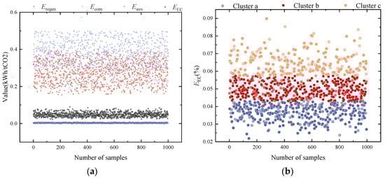 (a) Scatter plot of carbon capture energy consumption; (b) clustered scatter plot of carbon capture energy consumption.