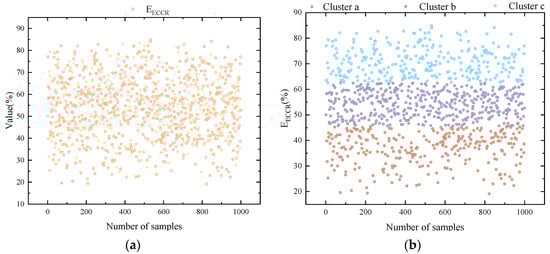 (a) Scatter plot of carbon capture rate distribution; (b) clustered scatter plot of carbon capture rate distribution.