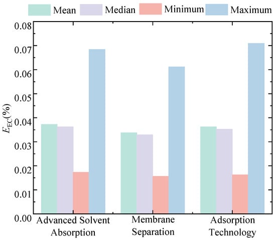 The technology assessment is shown in Table 2 and Figure 7. The results indicate a significant nonlinear relationship between the energy consumption and cost characteristics of the CCUS system. Multivariable regression analysis reveals a threshold effect between overall energy consumption and the capture rate. When η is below 85%, the average energy consumption per ton is 0.035 ± 0.010 GJ/tCO2, whereas under high-efficiency conditions (EECCR ≥ 92%), energy consumption increases by 58.3% to 0.055 ± 0.018 GJ/tCO2—a statistically significant difference with p < 0.01.
