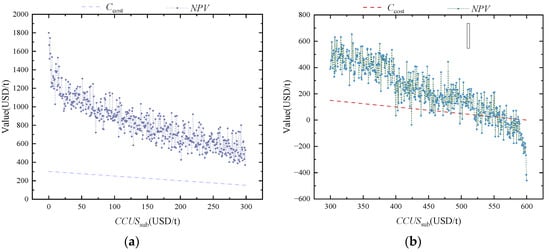 (a) NPV-CCUS subsidy curve under low-subsidy-price scenario; (b) NPV-CCUS subsidy curve under high-subsidy-price scenario.