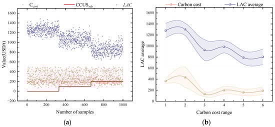 (a) Schematic diagram of LAC evaluation results; (b) LAC-carbon cost trend error band chart.