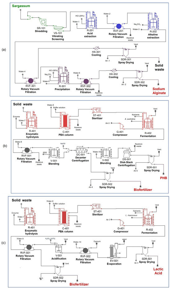 Although the arrival of sargassum in the CMC is considered a threat to the population and the environment, this study proposes the design of biorefineries as an alternative for its valorization. Four possible configurations were proposed for the design of a biorefinery to generate useful products in the biopolymer industry, such as SA, PHB, and LA (as a precursor to polylactic acid), and these were compared with a bioenergy cogeneration process. The results contribute to the following: