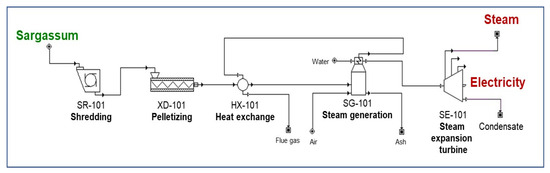 For this configuration, the cogeneration of electrical energy and water vapor is proposed, as shown in Figure 2. First, the particle size of the dried sargassum is reduced in the SR-101 shredder and then compacted into pellets using the XD-101 equipment. Subsequently, the pellets are preheated (HX-101) with flue gases from the boiler (to harness and integrate the heat). Subsequently, the material is introduced into a steam generator (SG-101), where combustion reactions occur. Finally, the high-pressure steam generated is sent to the power generation in an extraction steam turbine (SE-101).