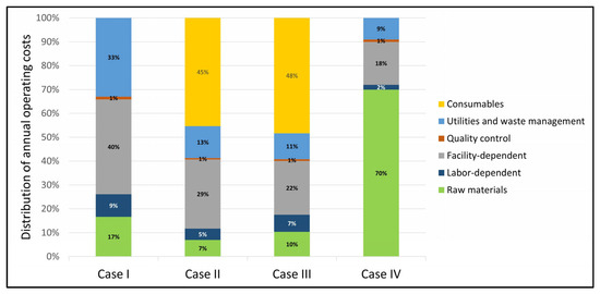 Regarding the annual operating costs presented in Table 4, it can be observed that the estimated values vary significantly for each case study. This is because each processing technology has different requirements for raw materials, labor-dependent costs, facility-dependent expenses, quality control, consumables, utilities, and waste management. Regarding these latter economic concepts, Figure 3 shows the percentage distribution within the annual operating costs for all case studies. It can be observed that in some cases, the highest expenditure is on raw materials, in others on facility-dependent expenses or consumables (with the highest cost being the purchase of the enzyme, USD 3/kg, used in the hydrolysis of Cases II and III). Meanwhile, in all cases, the lowest percentage of costs corresponds to quality control, labor-dependent expenses, utilities, and waste management.