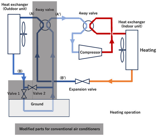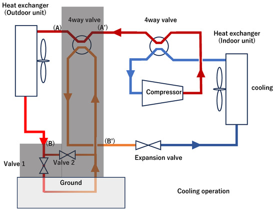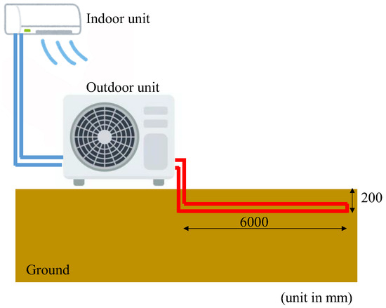 The purpose of geothermal heat exchange is to ensure an appropriate refrigerant temperature to achieve a high COP. It is widely known that COP can be improved in conventional air–thermal air conditioners by lowering (during cooling) or raising (during heating) the refrigerant temperature at the outlet of the outdoor unit heat exchanger [9,10]. Therefore, it is only necessary to reach the target refrigerant temperature downstream from the heat exchanger, and it is not necessary to bury the entire extent of refrigerant piping underground. This study investigated a method for enhancing outdoor heat exchange by adding underground piping at the downstream end of the outdoor heat exchanger. However, in conventional air and geothermal air conditioners, the flow of refrigerant differs between cooling and heating operations, so simply adding geothermal piping at the bottom of the air conditioner is not suitable.