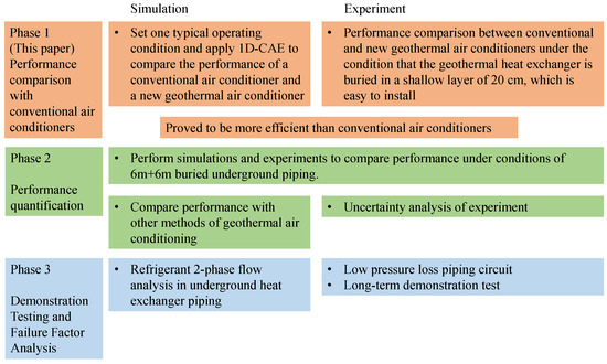 Therefore, a hybrid geothermal air conditioner (Figure 1) that (1) does not change the control system of a conventional air conditioner, (2) achieves geothermal heat exchange with a minimum specification change of bypassing two points of refrigerant piping, and (3) can be commissioned without underground piping in the same way as a conventional air conditioner is proposed. Figure 1 illustrates the hybrid system, showing the bypass flow paths and four-way valve integrating the ground heat exchanger. The purpose of this study is to evaluate the performance of the hybrid geothermal air conditioner (Figure 1) and to identify any associated issues. A geothermal air conditioner in this configuration is still unprecedented, and the authors plan to prove its performance according to the milestones shown in Figure 2.