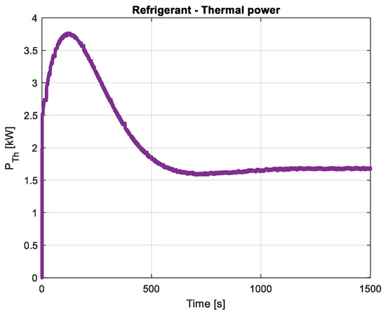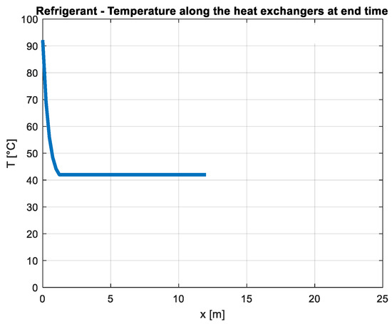 On the other hand, in the hybrid geothermal air conditioner, the ground heat exchanger provided supplemental cooling in situations where the heat exchange in the atmospheric heat exchanger was insufficient, enabling the refrigerant temperature to be lowered to 20 °C, equivalent to the ground temperature (Figure 9). This result demonstrates the effectiveness of the design of this system, in which only the downstream portion of the heat exchange is cooled by the ground heat exchanger. As a result, the load on the compressor was reduced and the power consumption was significantly reduced to 0.37 kW (Figure 7). The cooling output was 1.67 kW (Figure 8), and a COP of 4.51 was recorded. The hybrid system’s slightly lower cooling output is offset by its significantly reduced power consumption, yielding a higher COP. Furthermore, this system is expected to be able to withstand long-term continuous operation because the ground heat exchange is performed only during extremely hot weather when the capacity of the air heat exchanger is insufficient, thus minimizing the effect on the ground temperature. When comparing total heat rejection, conventional air conditioners generate 3.22 kW, while hybrid geothermal air conditioners generate 2.04 kW. It is presumed that the energy savings achieved by hybrid geothermal air conditioners are mainly due to improved condensation efficiency, but this will be verified through experiments and simulations under the same conditions in the future.