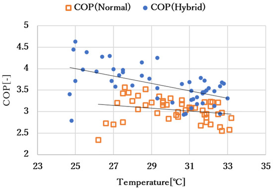 Figure 12 shows the results of a comparison of COP values calculated from cooling output and power consumption. The COP of the hybrid type was approximately 20% higher than that of the conventional type, regardless of the ambient temperature, indicating the superiority of the air/geothermal hybrid air conditioner. Figure 10 shows the hybrid system’s COP advantage, consistent across 25–33 °C ambient temperatures. In the future, when the ground heat exchanger is buried at a depth of several meters, a larger COP improvement effect is expected to be obtained.