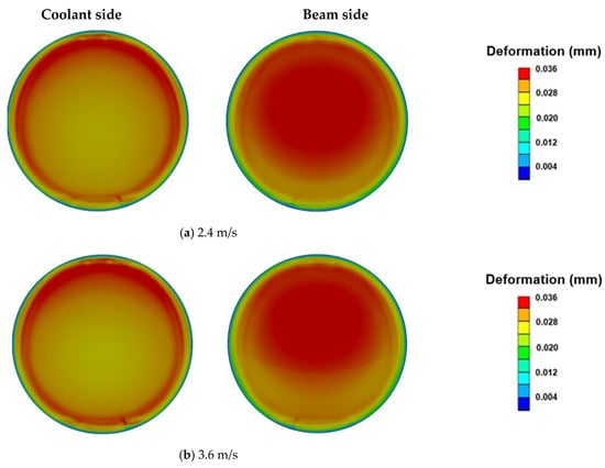 Thermal management through traditional single-phase convection is also simulated herein. An inlet velocity of 3.6 m/s and a pressure of 4 atm are set. However, a lower inlet temperature (283.15 K) is adopted in order to obtain higher convective heat transfer, resulting in the need for refrigeration equipment to obtain cooling water. Figure 15 compares the predicted temperature distributions along the central line on both sides of the target between these two cooling mechanisms. The abscissa in this figure also represents the distance (x) along the central line, which is schematically illustrated in the upper portion of Figure 12. It is clearly seen in this figure that the temperature distributions on both sides of the Be target when employing thermal management through boiling heat transfer are much lower than those using single-phase convection cooling. The corresponding deformation of the Be target under the single-phase cooling mechanism is presented in Figure 16. The maximum value of deformation is 53.7 μm for single-phase cooling with an inlet velocity of 3.6 m/s, which is much higher than that for boiling heat transfer cooling under the same inlet velocity. A comparison of Figure 13 and Figure 16 reveals that deformation of the target when employing thermal management through the boiling heat transfer is much smaller than that using single-phase cooling under the same inlet flowrate. This is one of the main advantages of boiling heat transfer applied in the thermal management of the AB-BNCT system. In order to clearly compare the simulation results of key parameter values under various operating conditions, Table 3 summarizes these sensitivity calculation results.