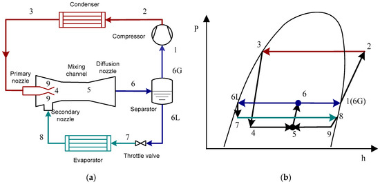 A layout diagram of the ejector expansion refrigeration cycle and the corresponding p-h diagram are shown in Figure 2.