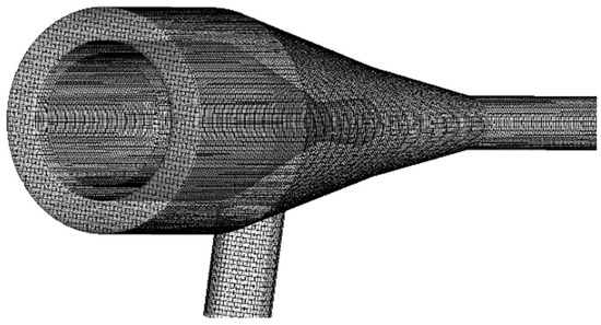 The computational domain was discretized using structured hexahedral elements generated with ANSYS ICEM 2020R2 as illustrated in Figure 3. To accommodate the complex flow features, the geometry was partitioned into three distinct zones: the primary nozzle, secondary nozzle, and mixing diffuser section. The standard k-ε turbulence model was employed, with careful consideration of the near-wall treatment limitations inherent to its boundary layer formulation. The selection of wall functions was guided by three critical factors: the flow regime characteristics, local equilibrium requirements, and computational grid constraints. After systematic evaluation, the standard wall function was implemented due to its reduced sensitivity to the near-wall mesh resolution, validated for y+ values between 30 and 300. This approach optimizes the balance between solution accuracy and computational economy for industrial-scale parametric studies.