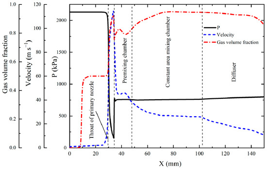 Distributions of pressure, velocity, and gas volume fraction along ejector centerline.