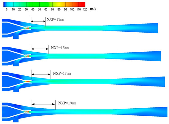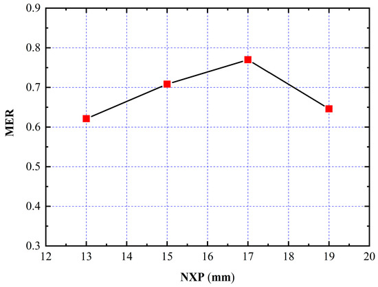Four nozzle exit positions (NXP = 13, 15, 17, and 19 mm) were investigated to analyze their influence on the MER. As shown in Figure 6, the MER exhibits an optimum at NXP = 17 mm (MER = 0.78), with suboptimal performance at both lower and higher positions. Below the optimum NXP, the MER increases gradually with the NXP, while, beyond 17 mm, it decreases sharply. This optimal NXP corresponds to approximately 3.5 times the mixing channel diameter (Dmix), aligning closely with the findings of Liu et al. [19,20], but slightly exceeding the values reported by Baek et al. [42] and Zhu et al. [48].