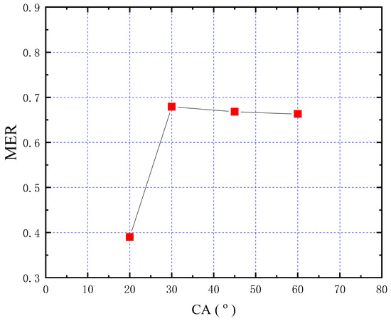 The MER exhibits significant dependence on the pre-mixing channel convergent angle (CA) while maintaining constant inlet/outlet diameters. As illustrated in Figure 8, the MER initially increases with the CA, peaking at 0.69 for CA = 30°, followed by a gradual decline at larger angles. This non-monotonic relationship confirms the existence of an optimal CA for the maximization of the ejector entrainment performance. The 30° optimum represents a balance between flow guidance and energy preservation, consistent with established two-phase ejector design principles.
