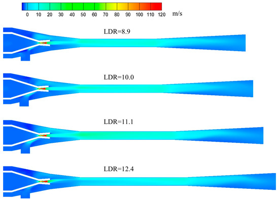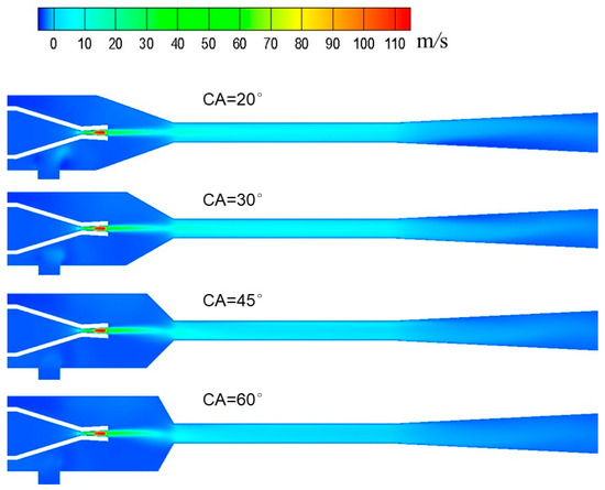 The velocity distributions (Figure 9) and streamline patterns (Figure 10) reveal the underlying fluid dynamics in the ejectors. Small CAs (<30°) restrict secondary flow passage, increasing the frictional losses by approximately 25% and reducing the entrainment efficiency. Optimal CA conditions (30°) provide a sufficient flow area for effective momentum transfer while maintaining flow guidance. Excessive CAs (>30°) cause a local high-pressure zone at the inlet of the mixing channel, hindering the suction of the secondary flow, and promote flow separation and vortex formation (Figure 9). The stronger the vortex, the greater the backflow, causing energy dissipation and reducing the effective entrainment capacity. The observed MER variation thus results from competing effects between flow area availability and viscous dissipation, with the 30° configuration achieving an optimal compromise between these factors.