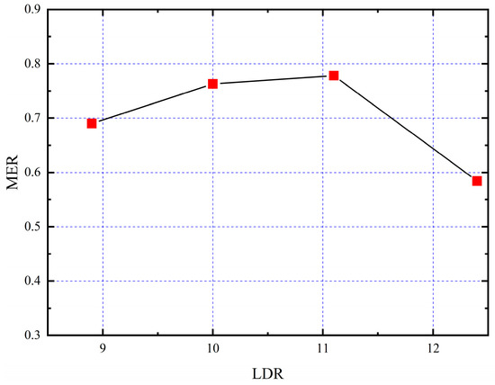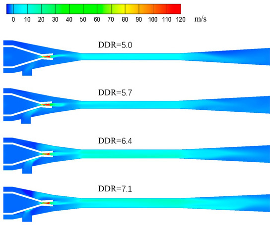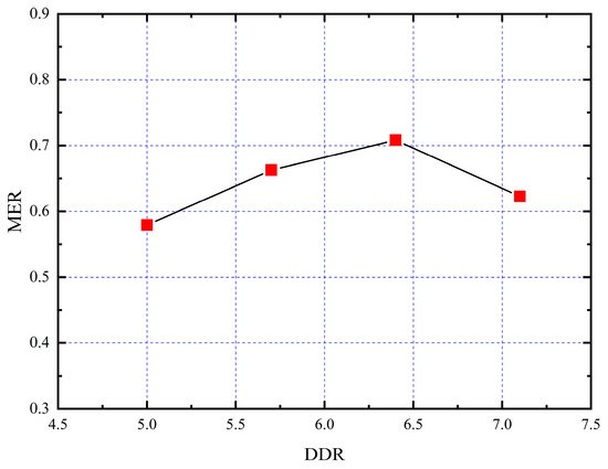 The diameter ratio (DDR), defined as Dmix/Dt, was investigated for four values (5.0, 5.7, 6.4, and 7.1) while maintaining a constant throat diameter. As shown in Figure 11, the MER demonstrates a clear optimum at DDR = 6.5 (MER = 0.71), with suboptimal performance at both smaller and larger ratios. Below the optimum DDR, the MER increases gradually, while, beyond this value, it decreases sharply. This optimal configuration agrees well with Baek et al. [35].