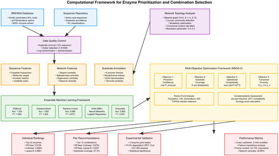 This study addresses these limitations by presenting a comprehensive computational framework for multi-objective enzyme prioritization and combination selection. The approach integrates machine learning classification with network-based analysis to develop a unified ranking system that simultaneously optimizes predictive confidence, functional diversity, and substrate complementarity. Unlike existing methods that focus on individual enzyme characterization, this framework explicitly addresses the systematic selection of enzyme combinations through Pareto-optimal multi-objective optimization. The methodology leverages ensemble machine learning algorithms trained on kinetic parameters from the BRENDA database, combined with sequence-derived physicochemical descriptors and network topology metrics derived from bipartite enzyme–substrate interaction graphs.