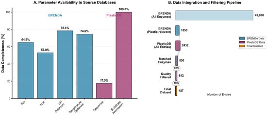 Data acquisition and quality control pipeline. (A) Parameter availability across source databases showing data completeness for key enzymatic and sequence features in BRENDA and PlasticDB repositories. Retention percentages (%) are shown for critical parameters (e.g., 64.9% for values in BRENDA). (B) Sequential filtering steps from initial database entries to final curated dataset, with retention percentages (%) at each quality control stage demonstrating systematic data curation for machine learning applications. Error bars represent experimental uncertainty in retention estimates.