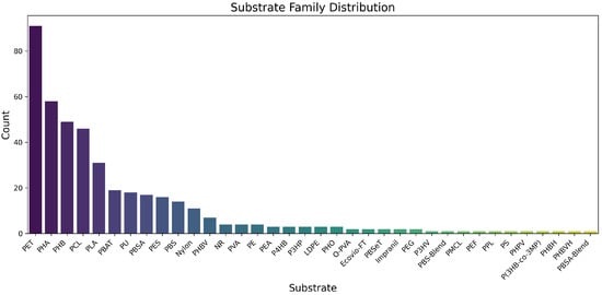 The curated dataset encompasses 487 enzymes distributed across six polymer families: PBS/PBSA (n = 89), PHB/PHBV (n = 76), polyester (PCL/PLA, n = 127), aromatics (PBAT/PET, n = 145), polyurethanes (n = 32), and nylon (n = 18). The substrate distribution is visualized in Figure 3, revealing the dominance of aromatic polymer-degrading enzymes while highlighting underrepresented families such as polyurethanes and nylon.