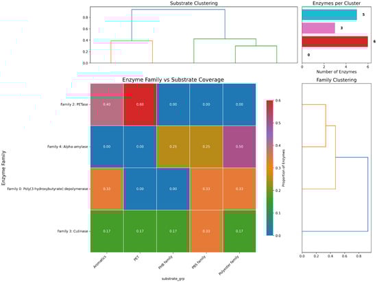 To elucidate family-level patterns and substrate preferences, we implemented hierarchical clustering algorithms to generate a comprehensive heatmap of enzyme family versus substrate coverage (Figure 4). This visualization reveals two predominant enzyme clusters with distinct substrate specificities: (1) a broad-spectrum cluster encompassing classical aliphatic polyester hydrolases (notably families 00018, 00019, and 00015) exhibiting substantial activity against both PET and PHB scaffolds, and (2) a more specialized cluster comprising substrate-specific esterases that preferentially catalyze the hydrolysis of PHA and PCL substrates. The dendrogram structure further indicates subclusters with unique substrate preferences, including a notable group of enzymes with activity toward polyurethane linkages, suggesting evolutionary specialization toward particular polymer architectures.