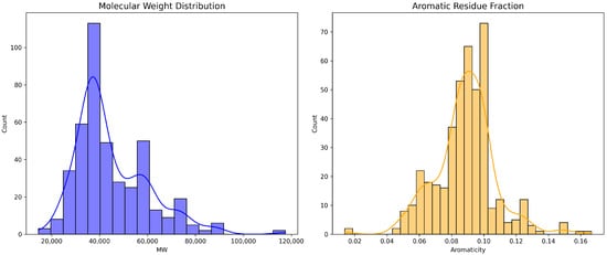 Distribution of key sequence-derived physicochemical properties across the enzyme dataset. (Left) Molecular weight (kDa) with mean = kDa; (Right) aromatic residue content (%) with mean = . Distributions reflect sequence-derived features for 1200+ enzymes.