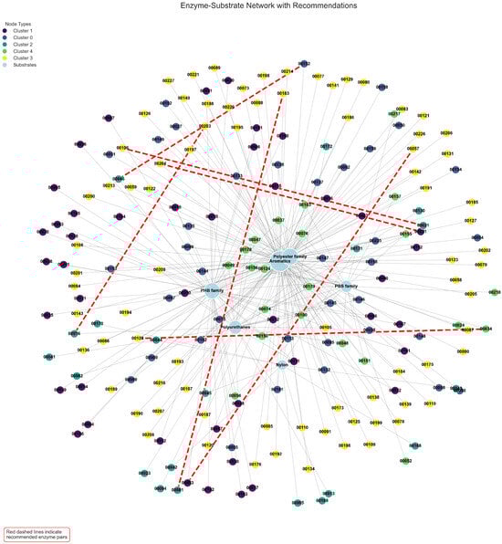 To investigate the higher-order structural organization of enzyme–substrate interactions, we constructed a comprehensive bipartite network representation, with enzyme nodes (differentiated by community assignment through color-coding) linked to their experimentally validated substrates. Figure 6 illustrates this network architecture, with our highest-scoring enzyme–enzyme recommendations superimposed as dashed red edges. This visualization reveals a striking modular organization characterized by a central core–periphery structure: a densely interconnected hub of aliphatic polyester hydrolases (predominantly representing PET and PHB degradation families) radiates outward toward specialized peripheral clusters comprising substrate-specific esterases, cutinases, and other hydrolytic enzymes.