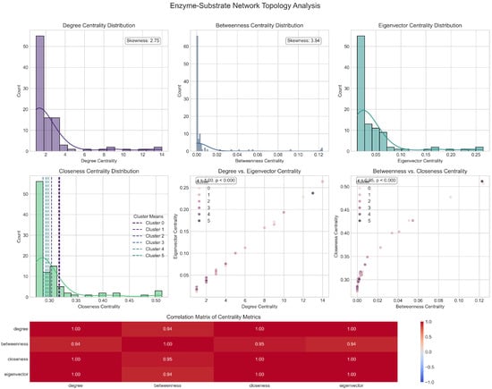 Eigenvector centrality measurements, though strongly correlated with degree (Pearson’s r = 0.94, p < 0.001), provide additional discriminative power by identifying enzymes that bridge otherwise disconnected substrate classes. These high-eigenvector-centrality enzymes represent particularly valuable targets for inhibition studies or protein engineering efforts, as modifications to their activity would exert disproportionate influence on the overall network connectivity and substrate processing capacity. The clustering of enzymes in the degree–eigenvector correlation plot reveals distinct functional groups, with Clusters 1 and 3 containing several enzymes with both high degree and high eigenvector centrality.
