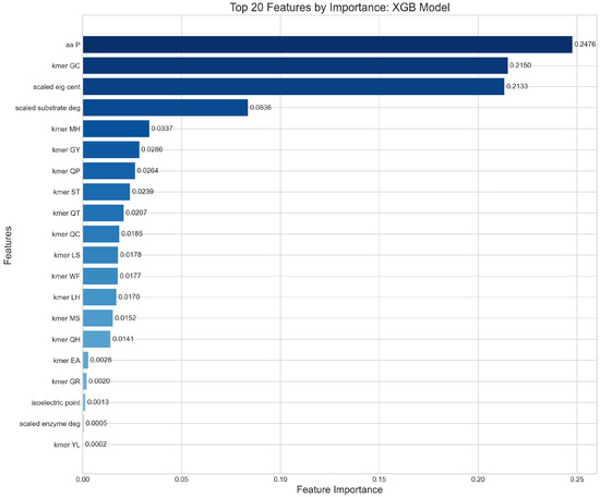 Relative contribution of the top twenty features to the XGBoost model’s predictive performance, with proline content (aa P) representing 24.73% of total importance.
